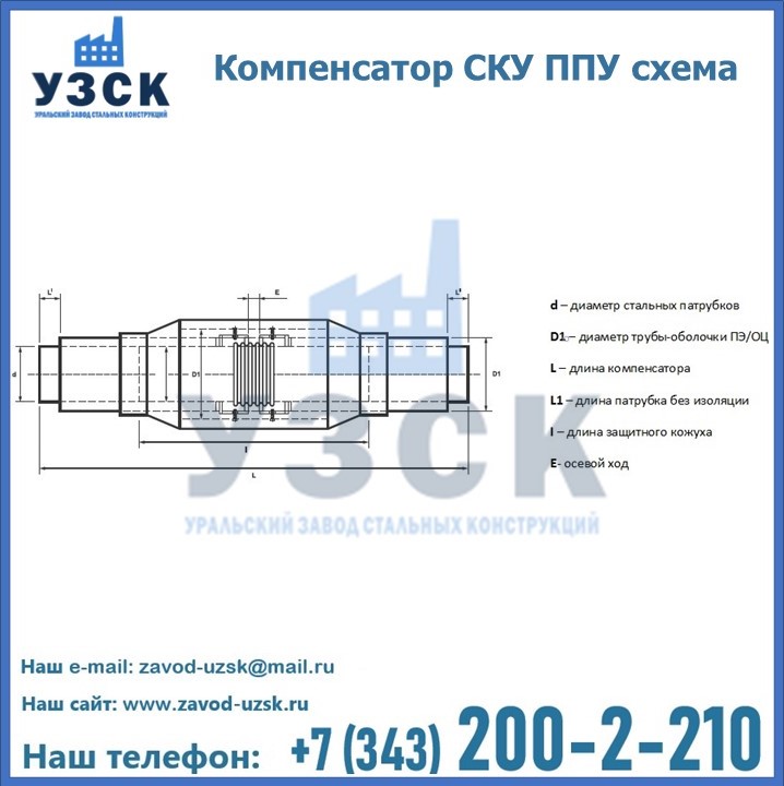 Уральский Завод Стальных Конструкций в Караганде предлагает готовые изделия, а также вы можете приобрести компенсатор СКУ ППУ под заказ. Наш завод располагает всем необходимым оборудованием для производства нестандартных позиций компенсатора СКУ в ППУ изоляции. Завод «УЗСК» предлагает большой выбор качественных и надежных компенсаторов СКУ ППУ, полностью укомплектованных и готовых к эксплуатации. Мы гарантируем соответствие нашей продукции всем требованиям ГОСТ и ТУ, износостойкость и высокую производительность. Наше предприятие поставляет и производит оборудование, имеющее длительную гарантию и большой эксплуатационный ресурс. Если вы хотите заказать сильфонные компенсационные устройства СКУ ППУ или другое оборудование с доставкой, наши специалисты помогут рассчитать стоимость транспортных расходов и организуют доставку товара. Вы можете оформить заказ на продукцию на нашем сайте, для этого достаточно заполнить форму обратной связи.