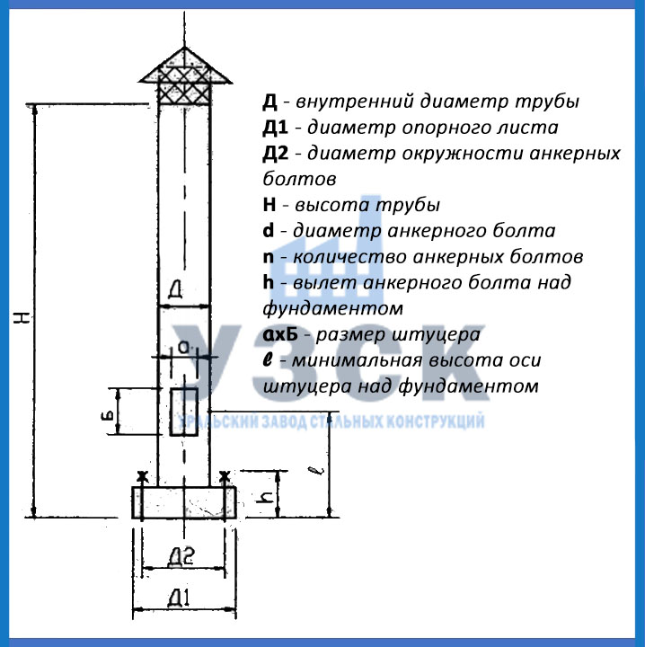 Например, обозначение Вз. Труба 1100-20-I-3-I-7,2 означает следующее: воздухозаборная труба внутренним диаметром 1100 мм, высотой 20 м, для I варианта нагрузок с сейсмичностью до 6 баллов, расположена по схеме №3 внутри промышленного здания с опиранием на покрытие, для I температурного режима, прохождение через покрытие на высоте 7,2 м.