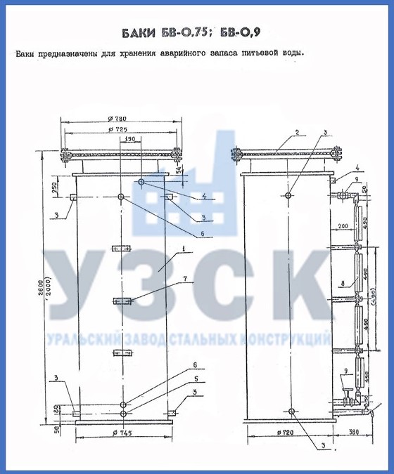 | Бак для воды БВ-8 | 8 м3 | 2934 | 2350 | 1731 | 1790 |